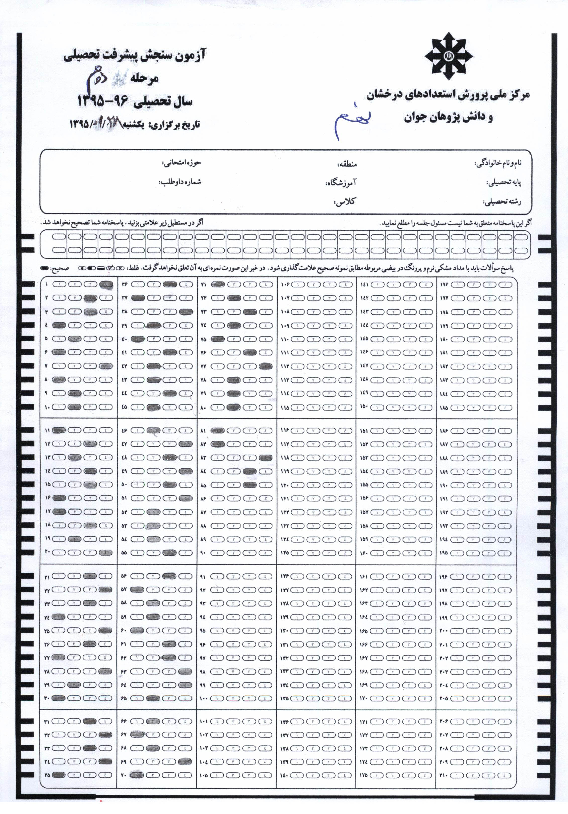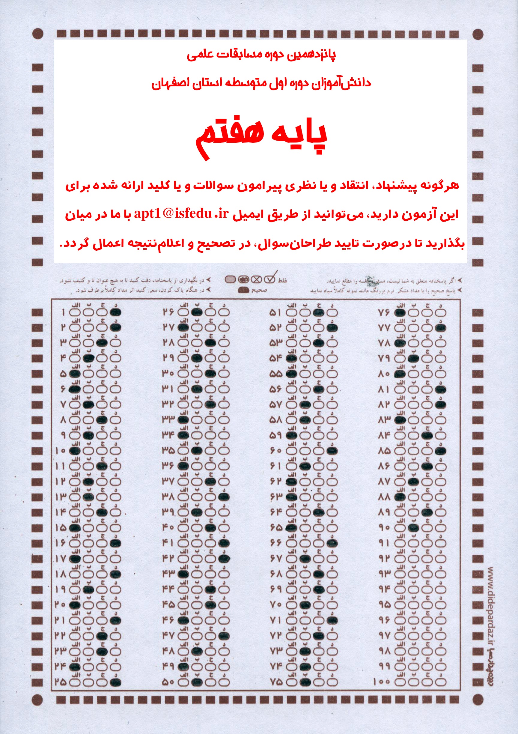 پاسخ نامه آزمون پیشرفت تحصیلی مرحله دوم پایه هفتم