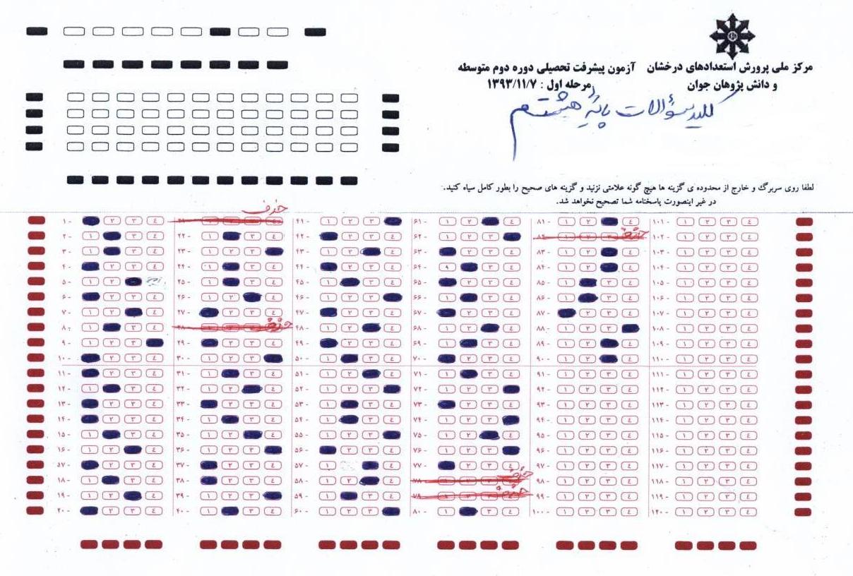 پاسخ نامه آزمون متمرکز سمپاد پایه هفتم مورخه 93/11/7