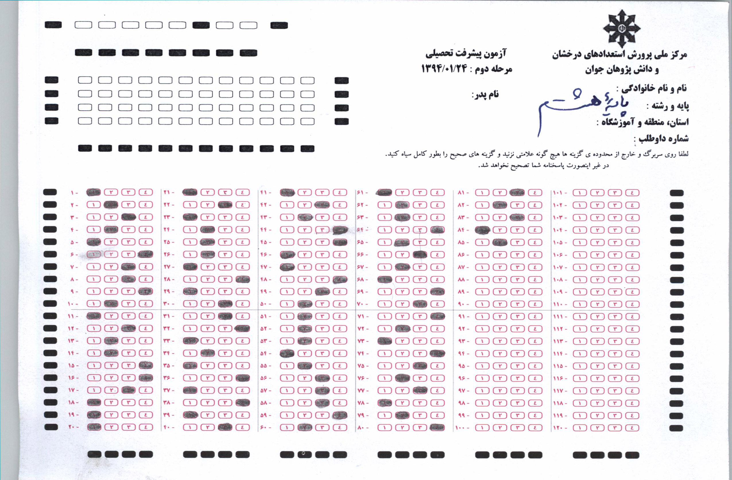 پاسخ نامه آزمون پیشرفت تحصیلی مرحله دوم پایه هشتم